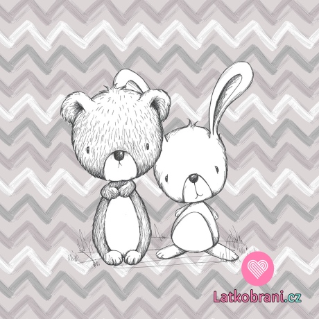 Bavlněný panel medvídek a zajíček na šedo - bílém chevronu