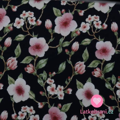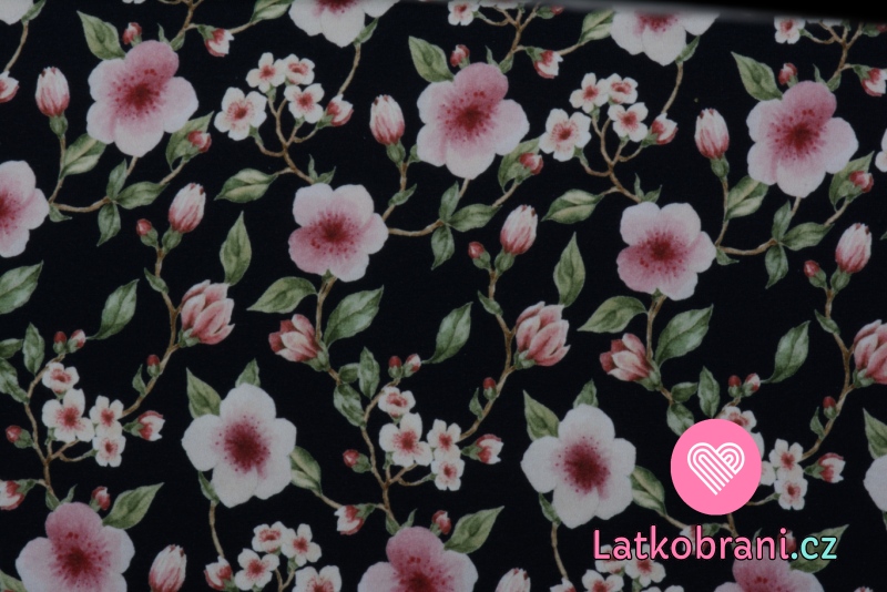 Teplákovina potisk kvetoucí bílo-růžové růže na tmavě modré, BIO
