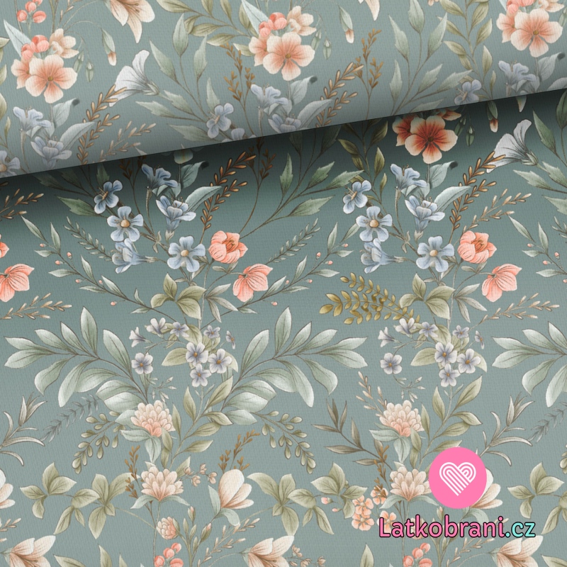 Teplákovina potisk vintage květinky s větvičkou na zelené