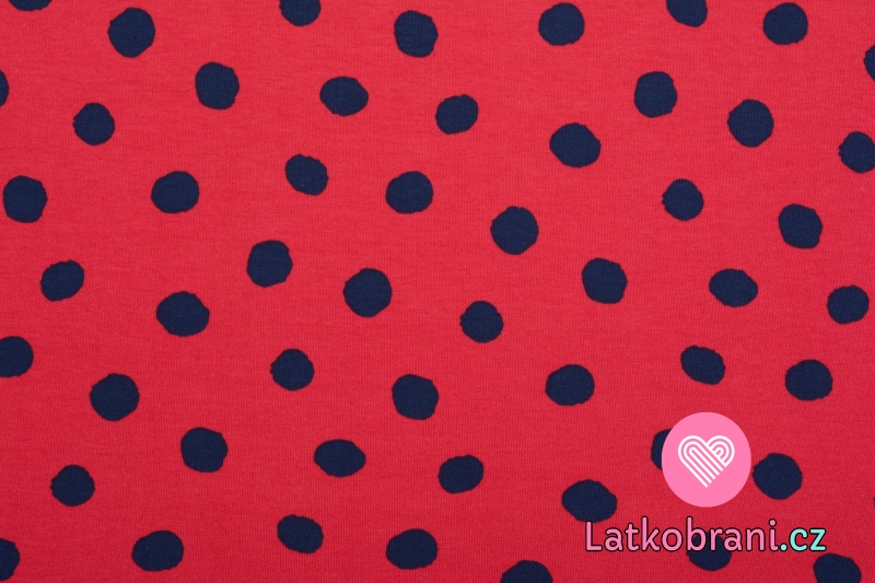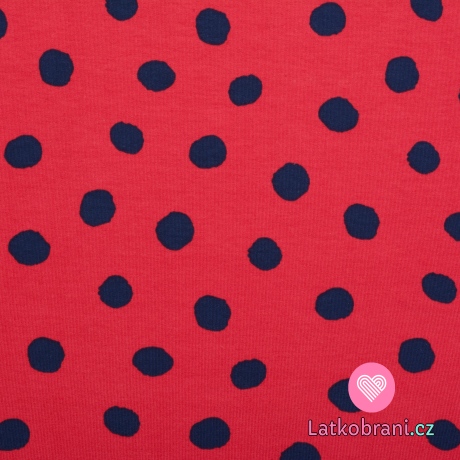 Teplákovina potisk nepravidelné tmavě modré puntíky na červené, BIO