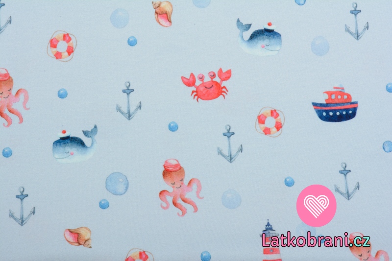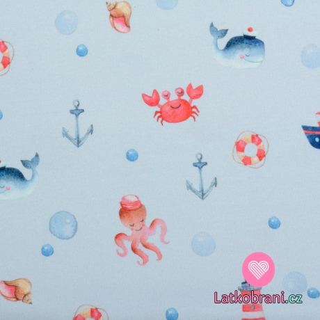 Úplet potisk mořský život chobotničky, velrybky a krabíka na světle modré, BIO