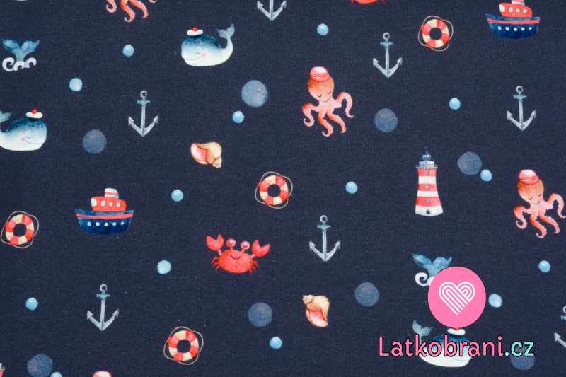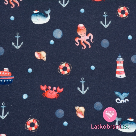 Úplet potisk mořský život chobotničky, velrybky a krabíka na jeansově modré, BIO