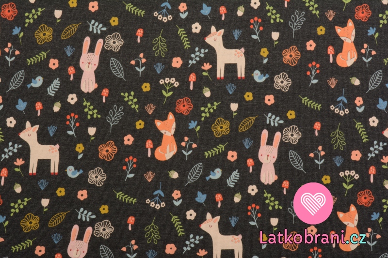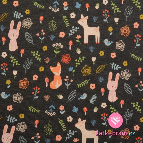 Úplet potisk koloušek, lištička a zajíček v lese na indigově modrém melé
