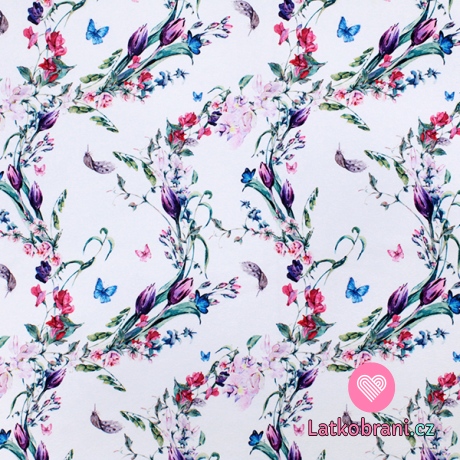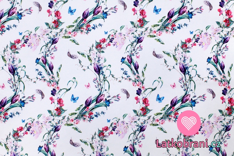 Teplákovina potisk barevné tulipány s motýlky na bílé