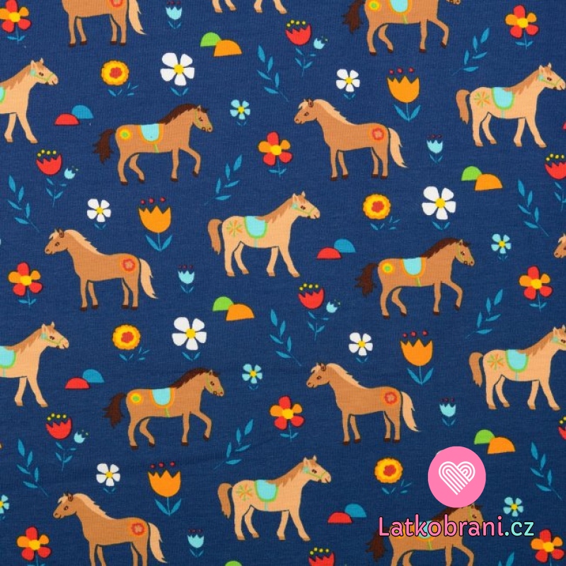Úplet potisk koníci mezi kytičkami na tmavě modré