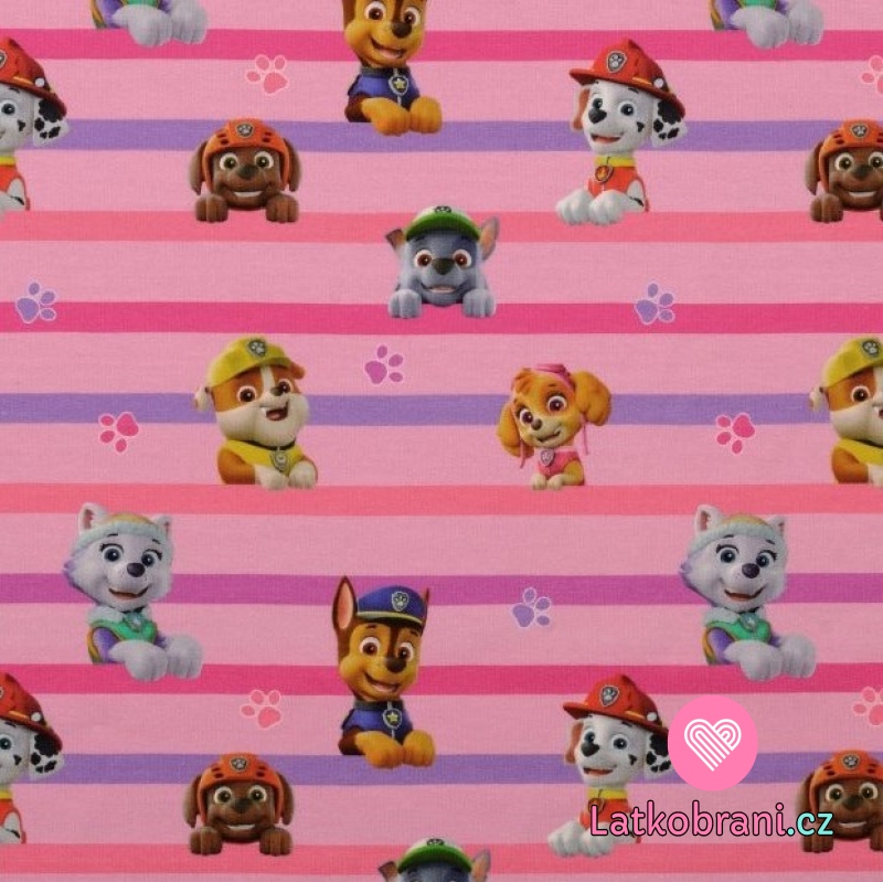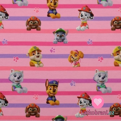 Úplet potisk "vykukující" hrdinové z Tlapkové patroly na růžovo-fialových proužcích