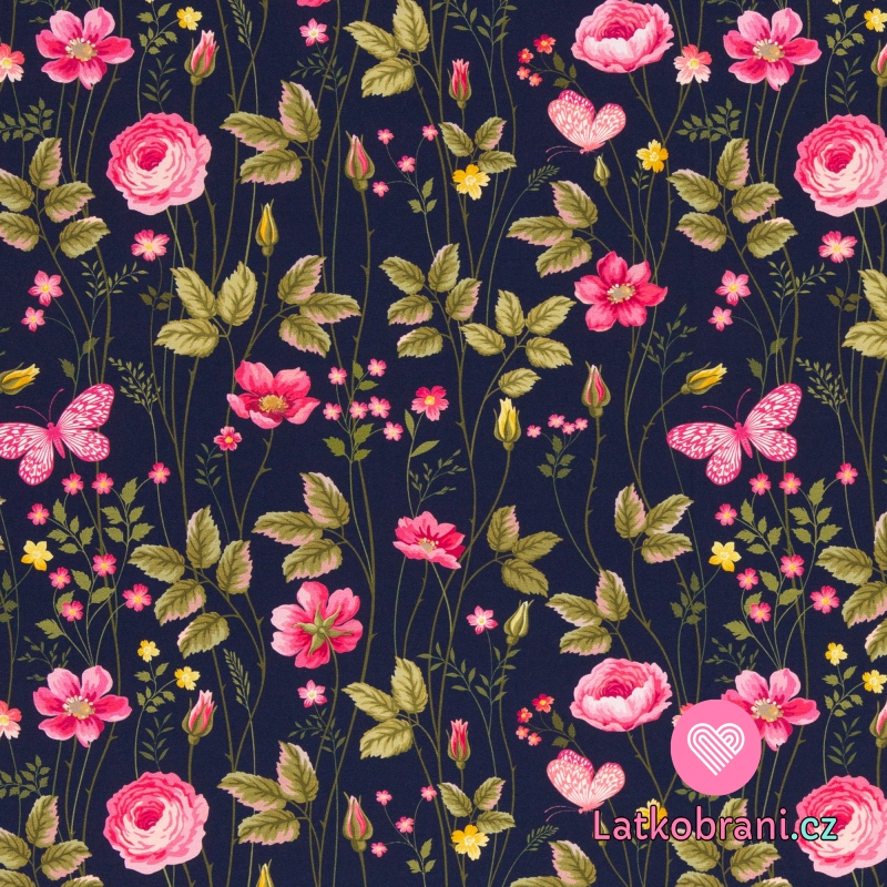 Úplet potisk rozkvetlá růžová louka na tmavě modré