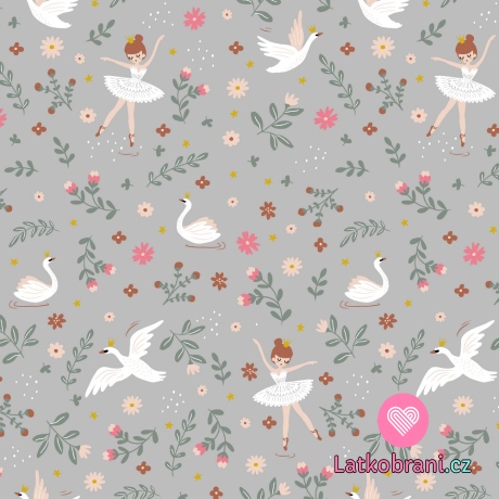 Teplákovina počesaná potisk tančící baletka s bílou labutí na světle šedé, BIO
