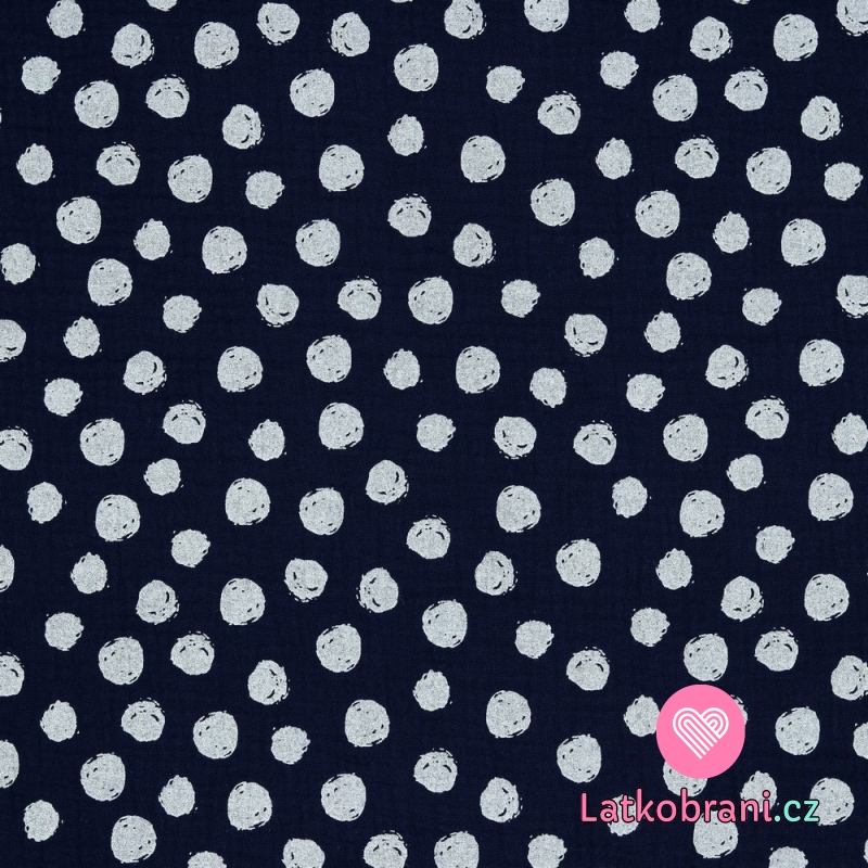 Dvojitá gázovina / mušelín nepravidelné puntíky na tmavě modré, BIO