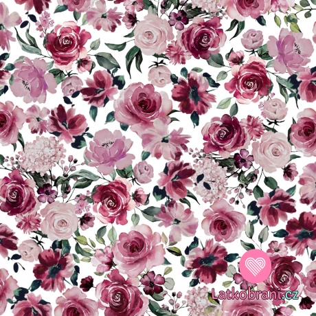 Teplákovina počesaná potisk rozkvetlé růžové květy na bílé, BIO