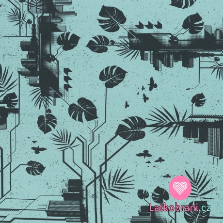 Úplet potisk moderní budova mezi listy na tyrkysové
