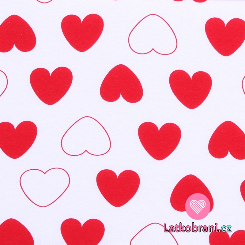 Bavlněný úplet potisk červená srdíčka na bílé
