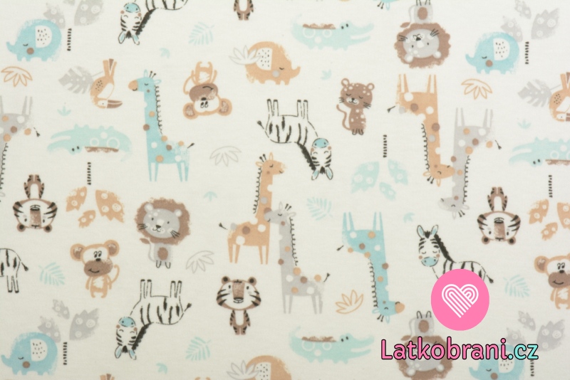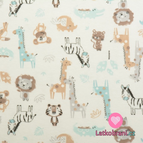 Bavlněný úplet potisk tyrkysová safari zvířátka na bílé