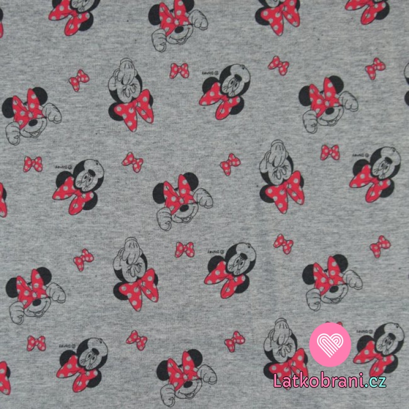 Teplákovina potisk hlavičky Minnie a růžové mašličky na šedém melé