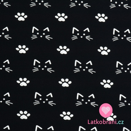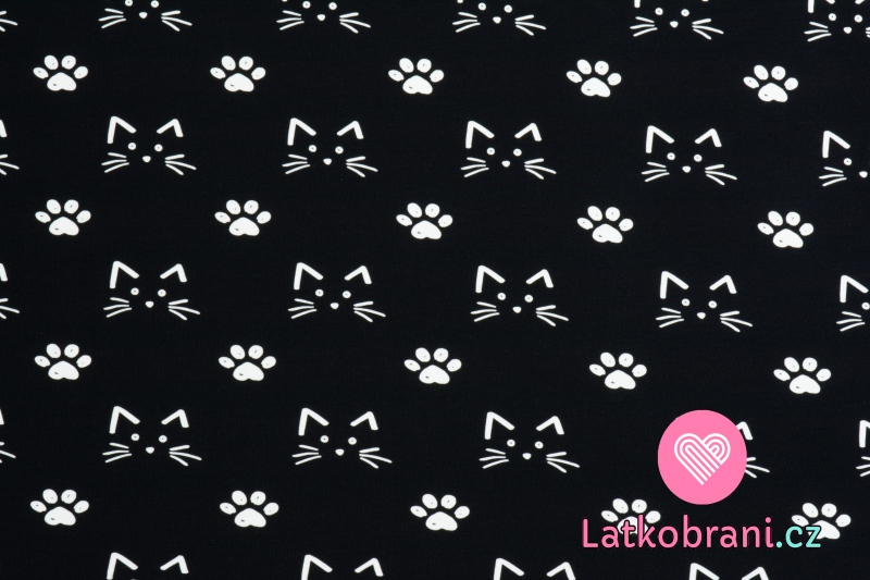 Teplákovina potisk kreslené kočičky mezi tlapkami na černé