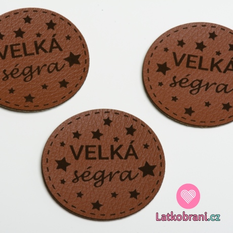 Štítek na oblečení kulatý "velká ségra", koženkový, imitace kůže