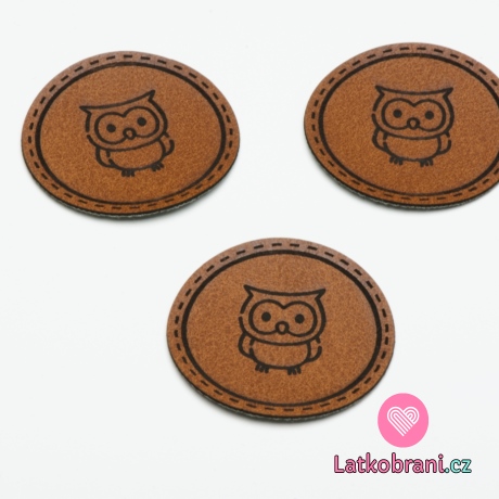Štítek na oblečení kulatý "sovička", koženkový, hladký povrch