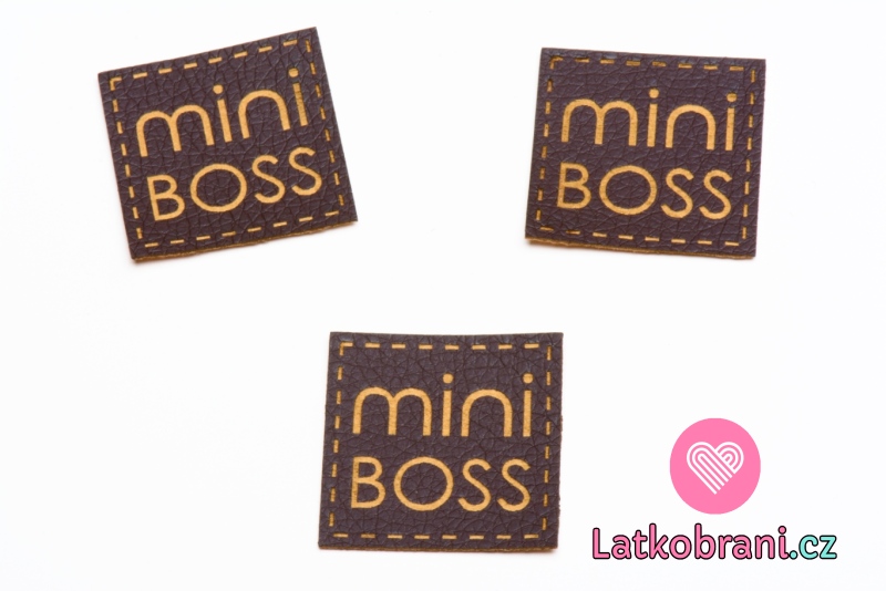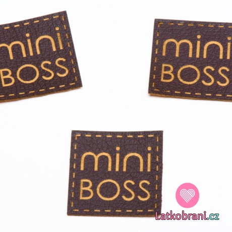 Štítek na oblečení "mini boss", koženkový, imitace tmavé kůže