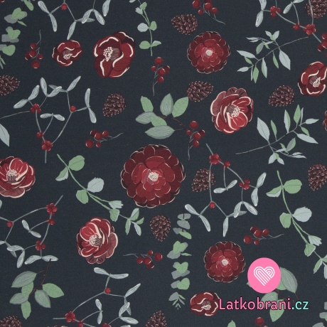 Teplákovina s příměsí modalu potisk čajové růže mezi šiškami a větvičkami na antracitové