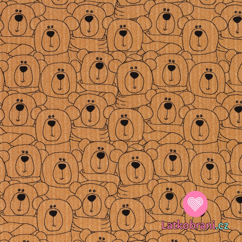 Teplákovina potisk medvídek Méďa na cihlovém podkladu se vzorem rybí kosti