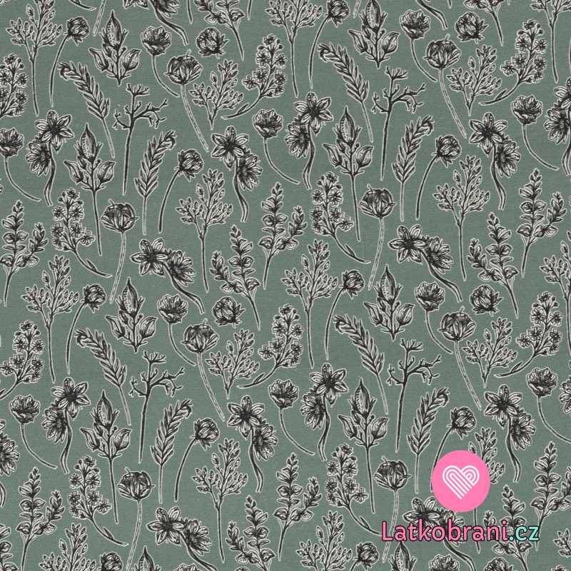 Teplákovina s příměsí modalu potisk černobílá kvítka na starozelené