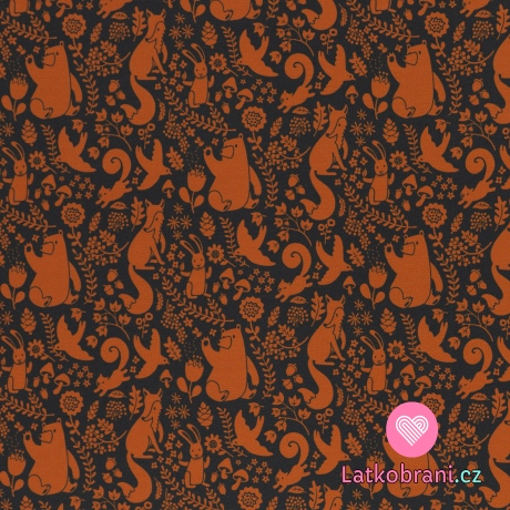 Teplákovina potisk oranžová lesní zvířátka na tmavě modré
