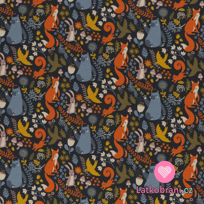 Teplákovina potisk lesní zvířátka na tmavě modré