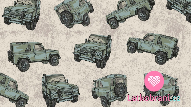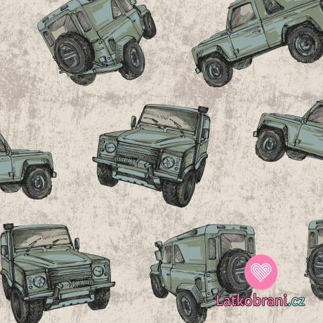 Teplákovina počesaná potisk zelený jeep na béžové