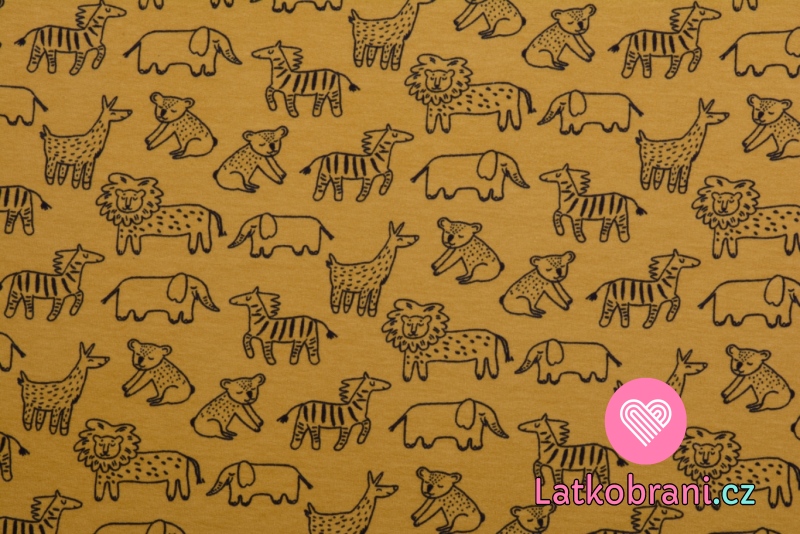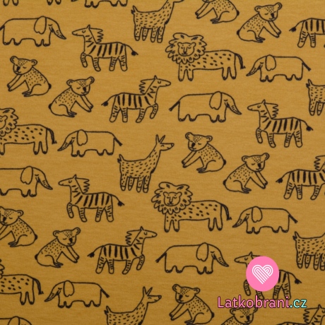 Teplákovina počesaná potisk safari zvířátka na okrové, BIO