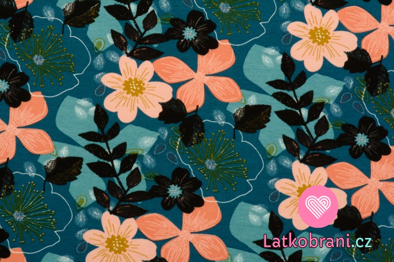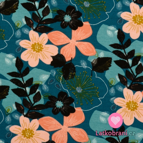 Teplákovina počesaná potisk barevné květiny na petrolejově zelené
