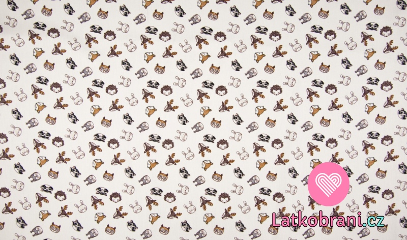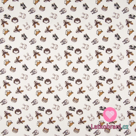Bavlněný popelín potisk hlavičky lesních zvířátek na bílé
